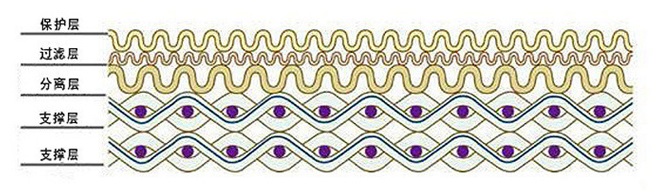 金屬濾芯所采用的復(fù)合網(wǎng)一般分為五層結(jié)構(gòu),分別為保護層、過濾層、分離層、支撐層四部分組成,燒結(jié)網(wǎng)材料易于成型、加工和焊接,制作方便。既有均勻穩(wěn)定的過濾精度又有較高的強度與剛度,對抗壓強度 要求高及過濾粒度要求均一的場合是一種理想的過濾材料。過濾原理為表層過濾,網(wǎng)孔孔道光滑,具有優(yōu)異的反洗再生性能,可以反復(fù)長期使用,非常適合連續(xù)化與自動化操作。
